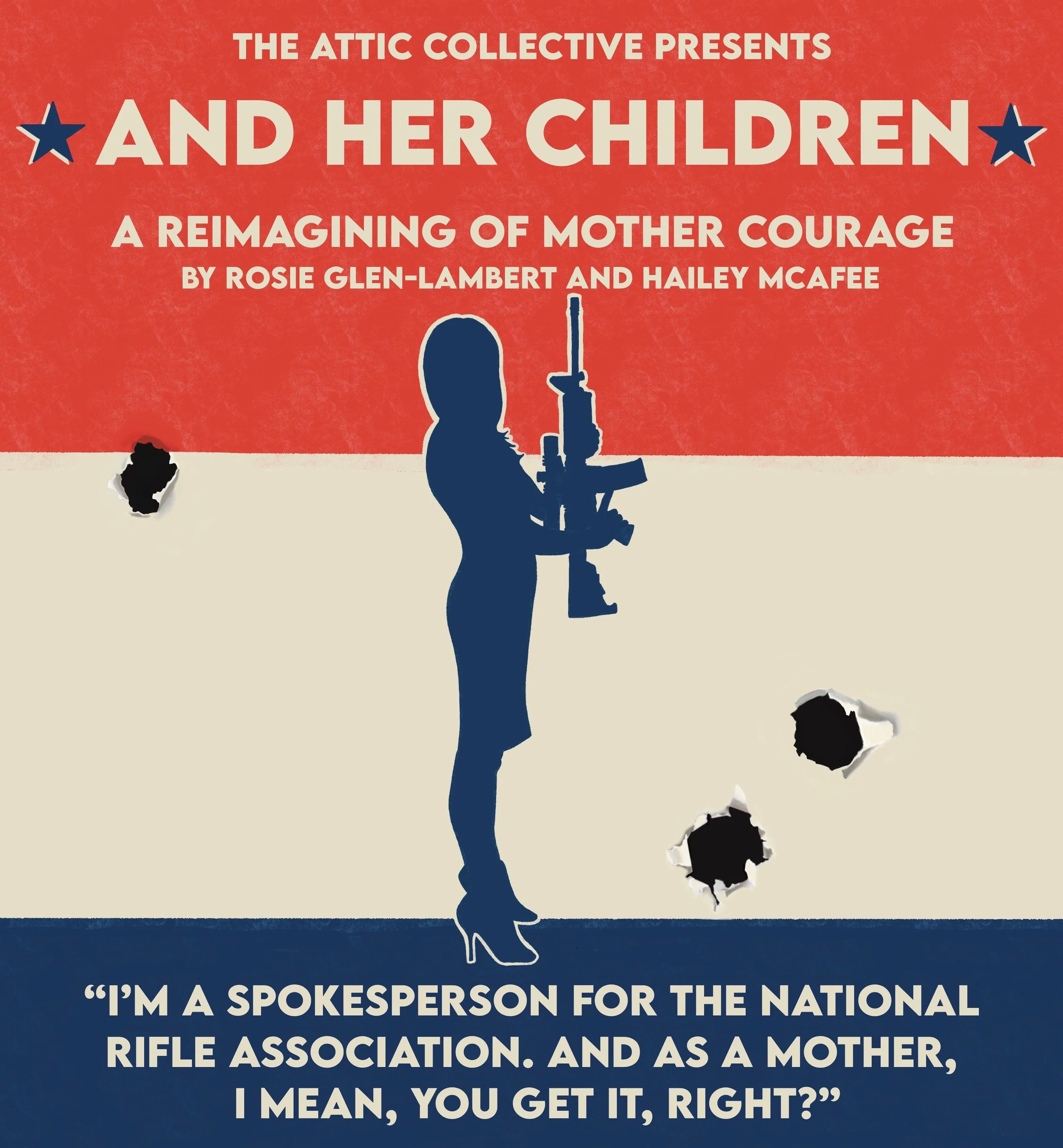 Inspired by Dana Loesch’s infamous appearance at a Town Hall following the Parkland shooting, And Her Children investigates America’s gun violence epidemic through the lens of those who are paid to defend the right to bear arms. Time holds still as our contemporary Anna Fierling is plummeted into a liminal space where the audience is a stand-in for her own troubled conscience. In this imagined space, she grapples with two gnawing questions: Has she been selfish? And will she keep her job?